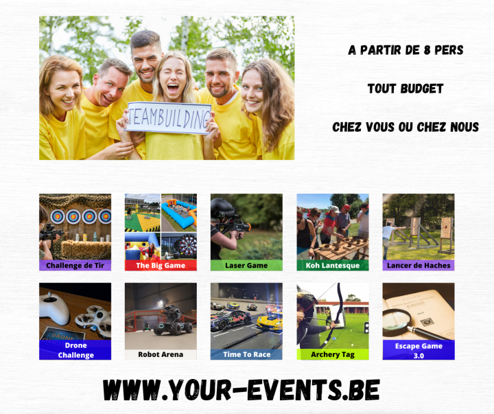 Activités avec animateur(s) : LaserGame, Bubble Soccer, Archery Tag, Taureau mécanique, Quad, The Big Game, Jeux gonflables, Venture Quest, Quizz Interactif,..