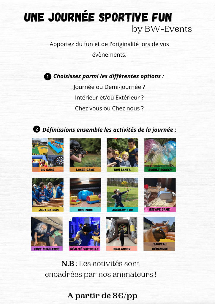 ACTIVITÉ ÉCOLE Pour votre journée scolaire BW-Events vous proposes une demi journée ou journée fun chez vous ou chez nous ( Ottignies ) RetourVotre message a été envoyé Nom(obligatoire) Attention E-mail(obligatoire) Attention Téléphone(obligatoire) Attention Nom de l’école Attention Durée souhaitée(obligatoire) Select one option Demi-Journée Journée Attention Lieu souhaité(obligatoire) Select one option Chez vous ( Au sein de votre établissement ) Chez nous ( Ottignies ) Attention Age des participants Attention Nombre approximatif de participants Attention Message Attention Attention ! EnvoyerEnvoi du formulaire Δ J’aime chargement…