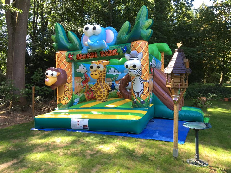 Château gonflable avec toboggan sur le thème de la jungle
