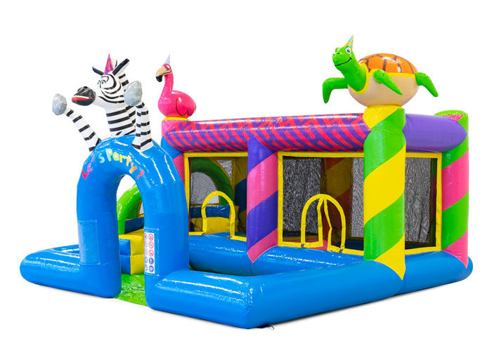 Petit château gonflable avec toboggan sur le thème de la jungle