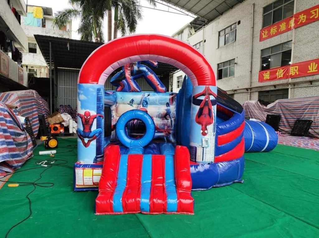 Petit château gonflable avec toboggan sur le thème de Spiderman